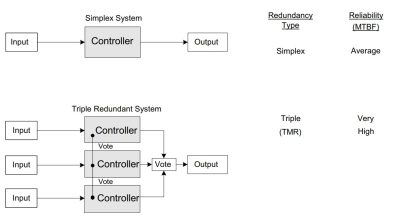 در معماری سهماژول (TMR)، ورودیها توسط سه کنترلر خوانده شده و با استفاده از الگوریتم رأیگیری، مقدار صحیح انتخاب میشود؛ خروجیها نیز به همین روش تولید میگردند. بهاین ترتیب، خرابی یا انحراف یک سنسور یا برد خروجی باعث توقف سیستم نمیشود. مزیت دیگر این است که نرمافزار کاربردی را میتوان بهصورت آنلاین و بدون نیاز به راهاندازی مجدد اصلاح کرد، که انعطافپذیری بینظیری در شرایط عملیاتی فراهم میکند.